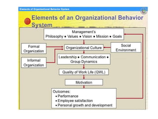 2. Organizational behavior is defined as the study of how individuals, groups, and structure impact behavior in organizations. It has four main elements - people, structure, environment, and technology.