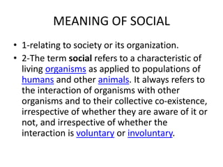 1. The document discusses the meaning of social behavior and organizational behavior. It defines social behavior as behavior directed towards society or between members of the same species.