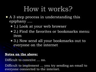 Social bookmarking allows internet users to store, organize, search, and share bookmarks of web pages through online services. Popular social bookmarking sites include StumbleUpon, Delicious, Reddit, and Digg. The key advantages are that bookmarks can be accessed from anywhere through these online services, and users can discover new pages through browsing tags and ratings added by other users. However, there is a risk of spam if sites generate fake positive ratings to appear more popular than they are. Social bookmarking is also related to social networking, as some sites allow linking to other social profiles.