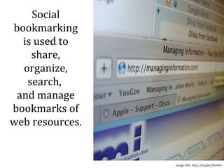 Social bookmarking tools like Diigo and LiveBinders allow users to organize, tag, and share web bookmarks and resources. These tools incorporate tagging capabilities that help describe items and allow them to be found through browsing or searching. Users can create accounts, make collections called binders or groups, add web links with tags, and share their collections with others. The document provides links and instructions for setting up accounts with Diigo or LiveBinders and demonstrates how to use their features to annotate, archive, organize, and share information online.