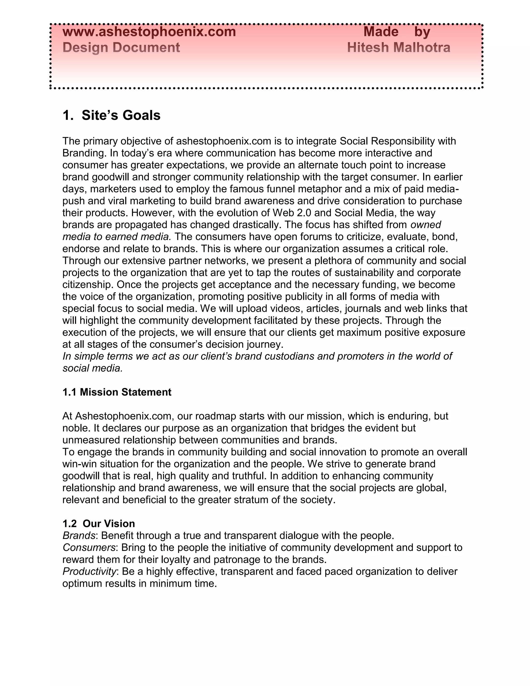 The document outlines the goals and vision of the website ashestophoenix.com, which aims to integrate social responsibility and branding. It does this by connecting organizations with social projects in need of funding and then promoting the projects through earned media like social media. This helps build goodwill for the organizations and strengthen their relationships with communities. An example is provided of how they helped a food company repair its brand image after a contamination issue by funding and promoting an anti-hunger project. The document also discusses the intended audience, user scenarios, competitive landscape, planned site content and functions, and outlines for the site structure and visual design.