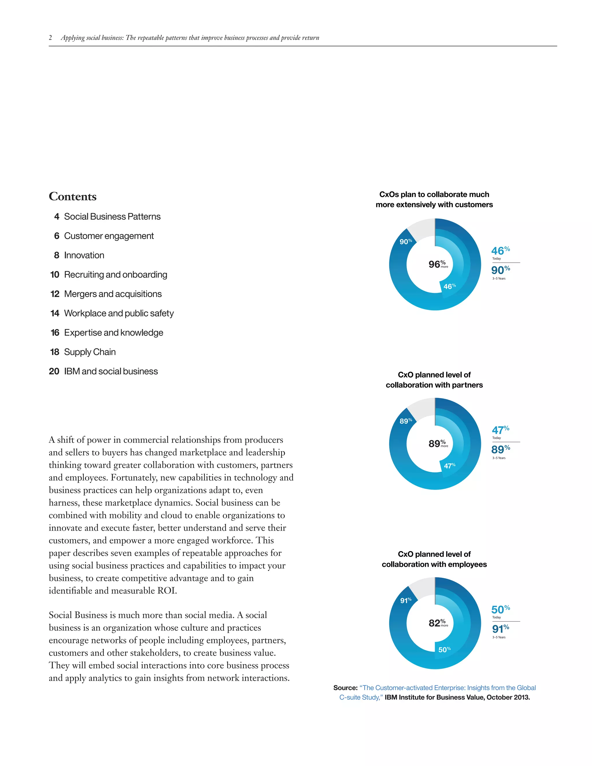 This executive white paper discusses how social business practices can be applied to improve key business processes and provide a return on investment. It outlines seven social business patterns that organizations have used successfully, including customer engagement, innovation, recruiting and onboarding, mergers and acquisitions, workplace and public safety, expertise and knowledge sharing, and supply chain management. The customer engagement pattern helps organizations build lasting relationships with customers through social tools to better understand and respond to individual customer needs across channels.