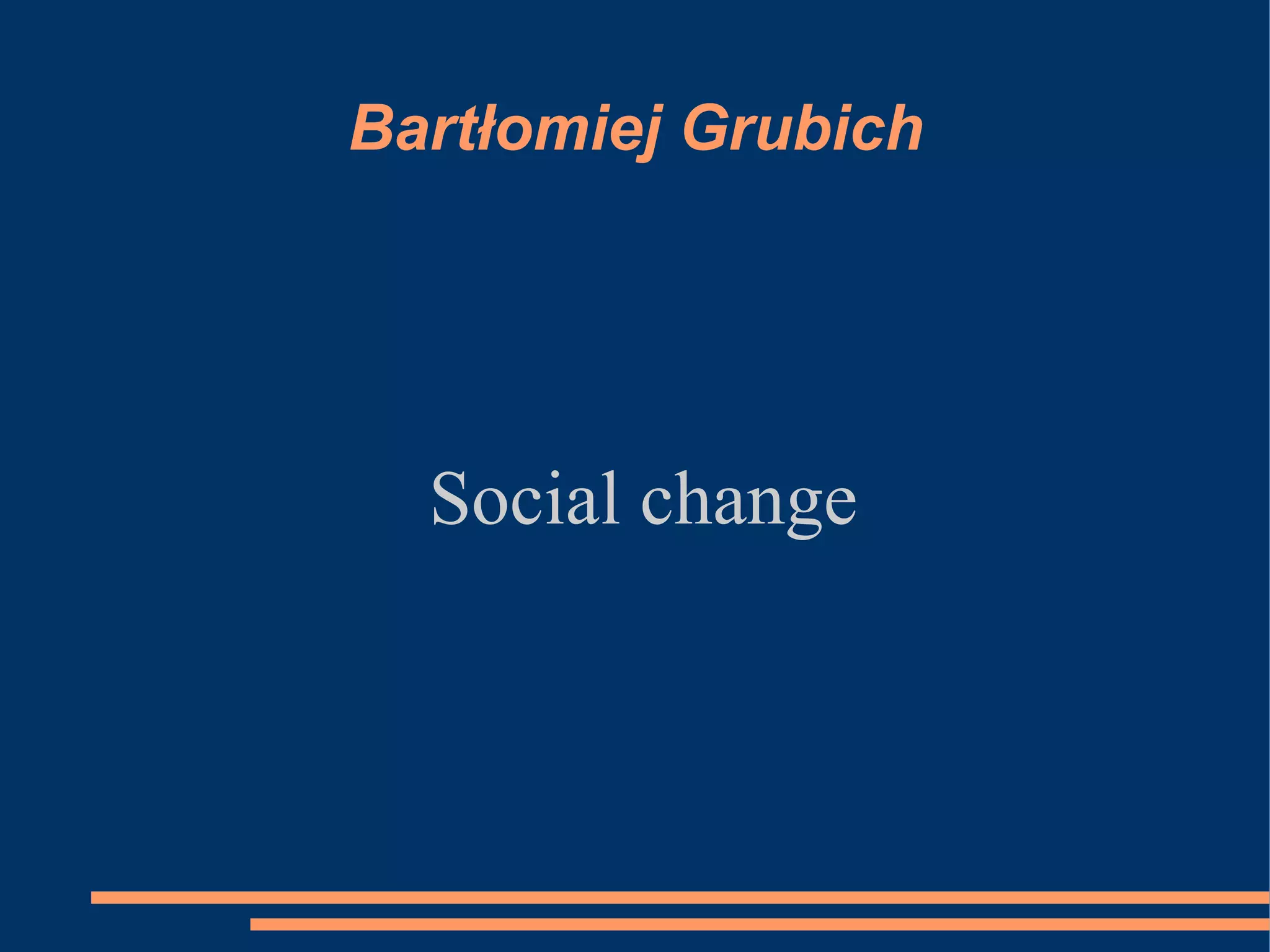 This document discusses the concepts of social change and globalization. It defines social change as the modification or transformation of how society is organized over time. Some types of social change discussed include endogenous vs exogenous change and social development vs social cycles. Globalization is defined in terms of technology development, the global market, speeding up of transport, and a balance of uniformity and diversity. Both the positive and negative impacts of globalization are acknowledged.