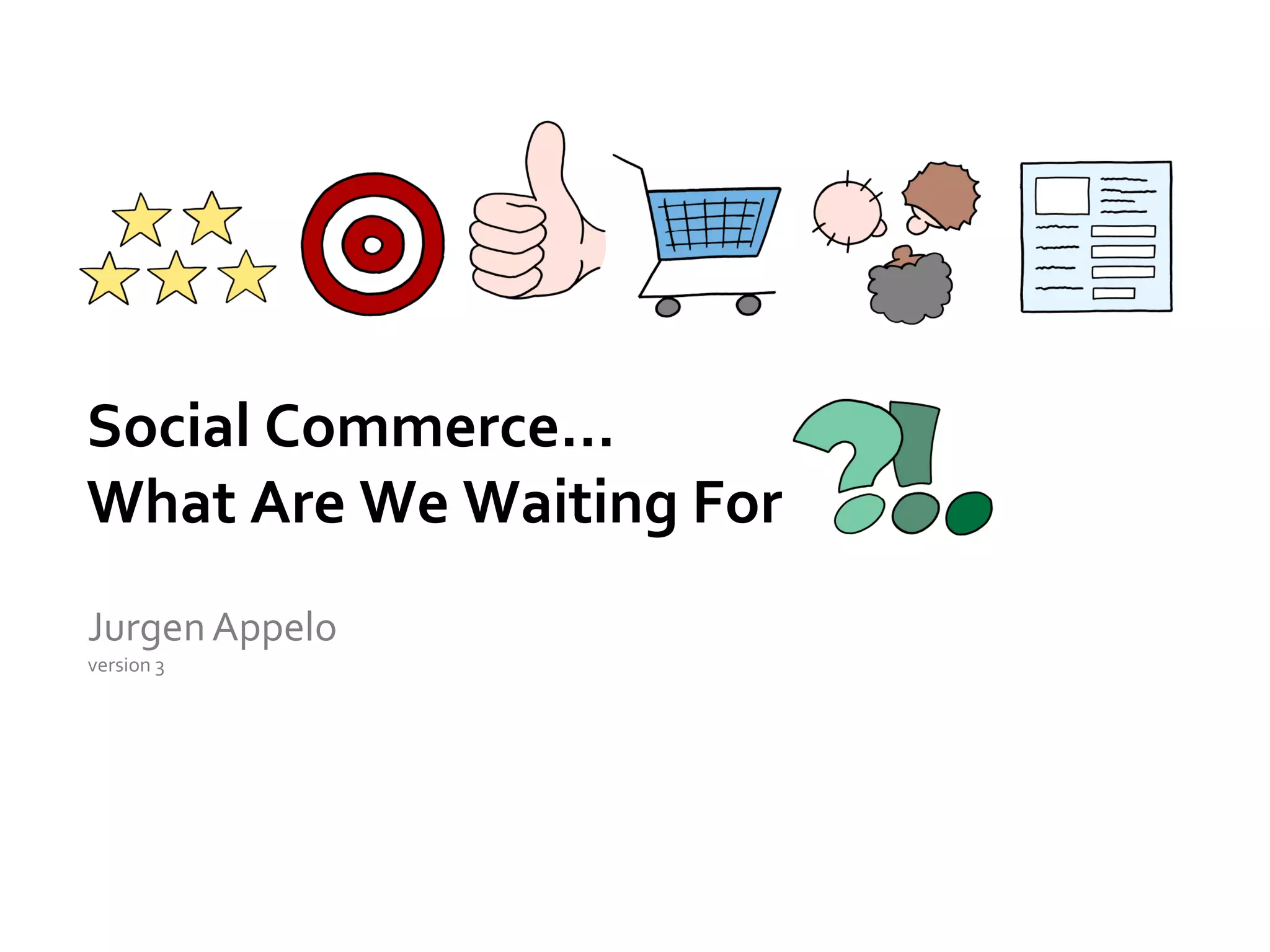 The document discusses social commerce as a transformative trend in e-commerce, emphasizing the importance of trust, social proof, and consumer engagement. It highlights key marketing strategies and trends such as audience control, social gaming, mobile content, and leveraging social networks for reviews and endorsements. The conclusion poses strategic questions for businesses to adapt to this evolving landscape of social media-driven commerce.