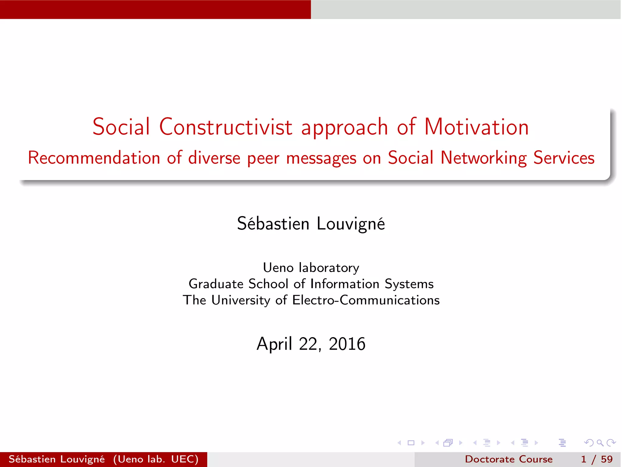 The document discusses a social constructivist approach to enhancing learning motivation through diverse peer messages on social networking services. It outlines research objectives, methodologies, and a recommendation system designed to analyze goal-based data from social media, ultimately to facilitate collaborative learning environments. The research emphasizes the importance of intrinsic motivation and the role of diverse perspectives in achieving educational goals.
