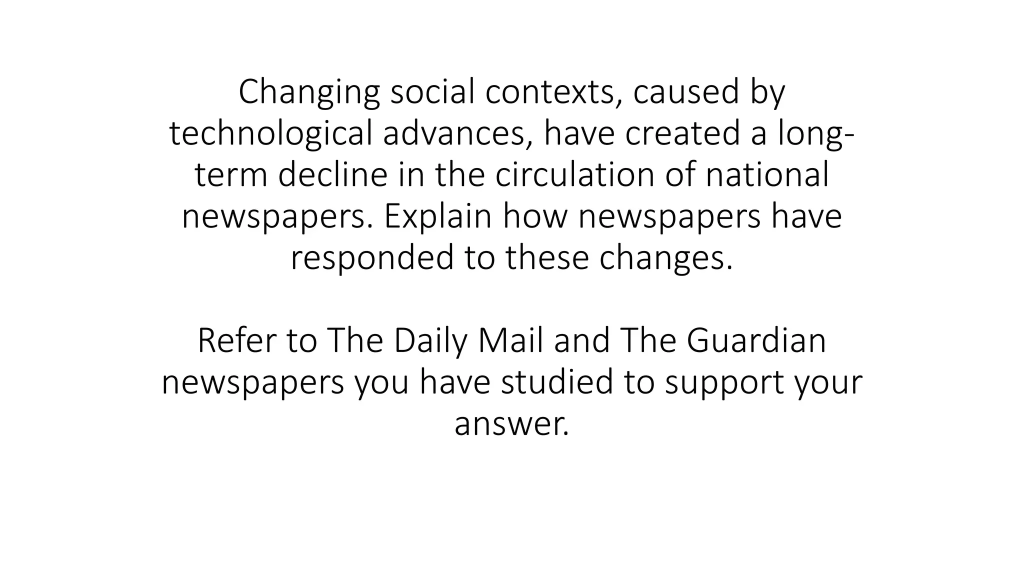 Changing social contexts caused by technological advances have led to a long-term decline in newspaper circulation. Newspapers have responded by diversifying into digital platforms like websites and apps to compensate for falling print revenue. For example, both The Daily Mail and The Guardian have developed their online presence through websites, Twitter feeds, and Facebook pages to attract audiences fragmented across multiple platforms and combat declining print sales.