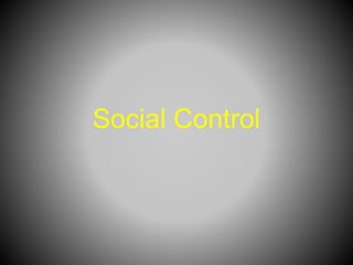 Social control consists of the methods used to regulate behavior in society. There are three main theoretical perspectives on social control - functionalists see it as necessary for survival, interactionists see it as a social process, and conflict theorists see it as benefiting powerful groups. There are three main types of social control - internalized norms, social structure, and formal/informal sanctions. Deviance is shaped by social forces like labeling, strain due to unequal access to goals, and cultural transmission of norms from one generation to the next. Conflict theory views social control as a mechanism for powerful classes to maintain their power and property over subordinate classes.
