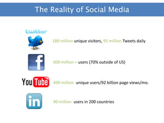 The document discusses the rise of social media and its implications for customer relationship management (CRM). It notes that over 180 million unique visitors access social media daily and over 600 million users are on social networks, with usage exceeding traditional email and search engines. As social network adoption increases across age groups, customers are more engaged and invested in social platforms. The document argues that companies must adopt social CRM tools to engage with customers on social media and gain insights from social conversations. It provides examples of early social CRM vendors and acquisitions in the space.