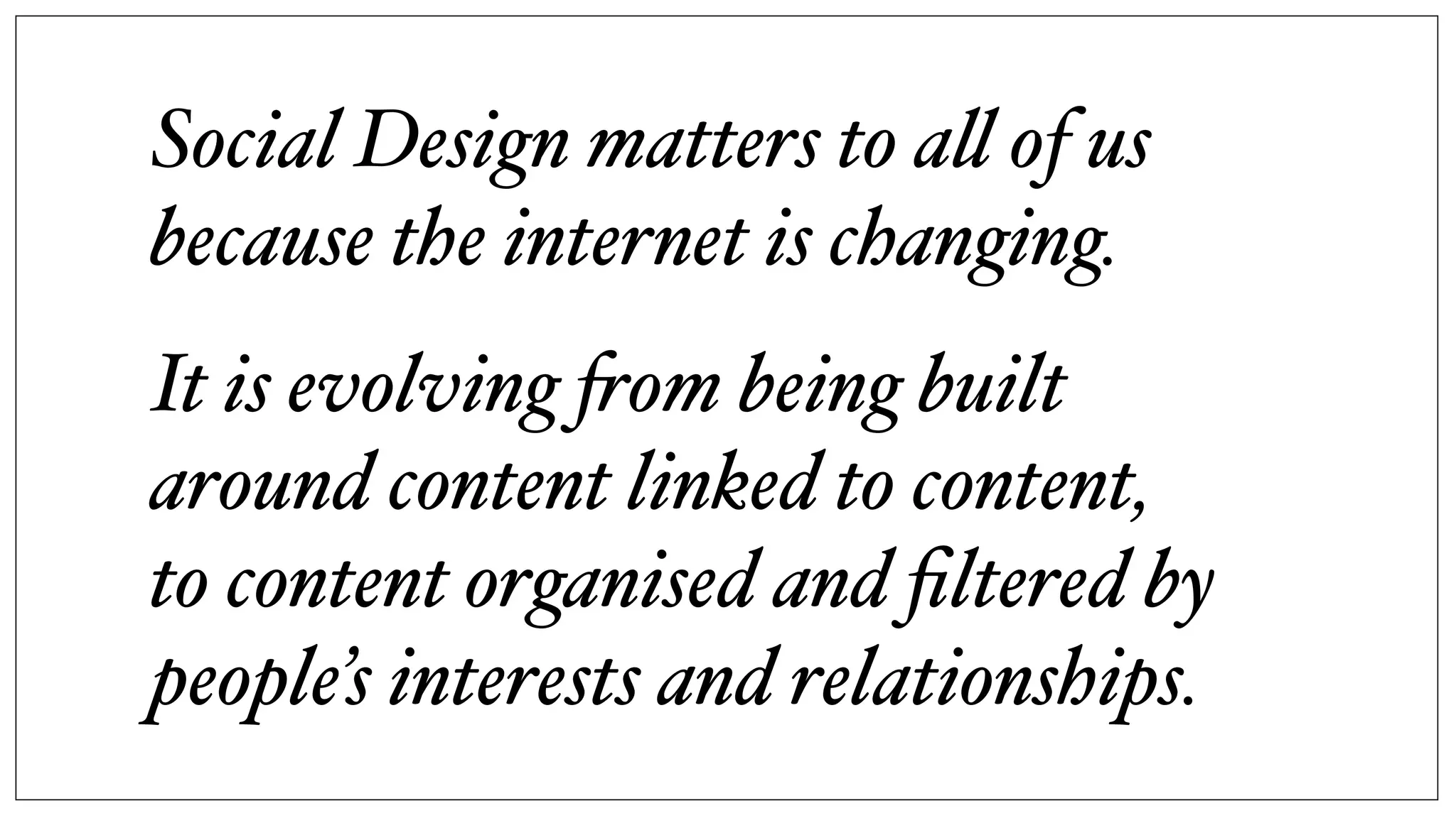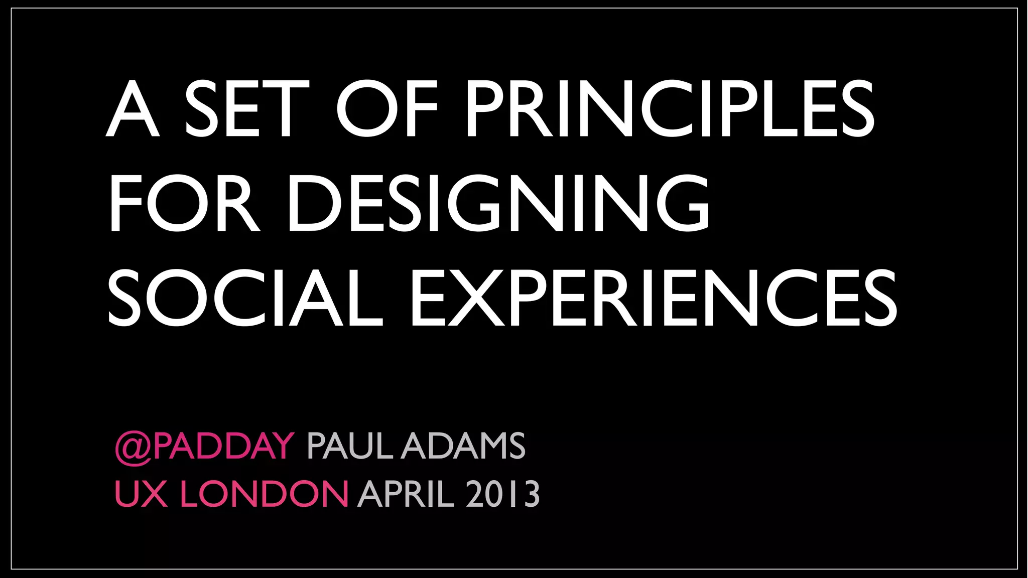 This document outlines principles for designing social experiences and interactions. It discusses how people live in networks and are influenced by others. It emphasizes designing systems, not just destinations, to account for these networks. It identifies three key areas of social design: identity, connectedness, and communication. For each area, it provides design principles such as giving privacy controls in context, showing commonalities between loosely connected people, and supporting lightweight interactions to build relationships over time. The overall message is that social design must consider how people are shaped by and engage with their complex social networks.