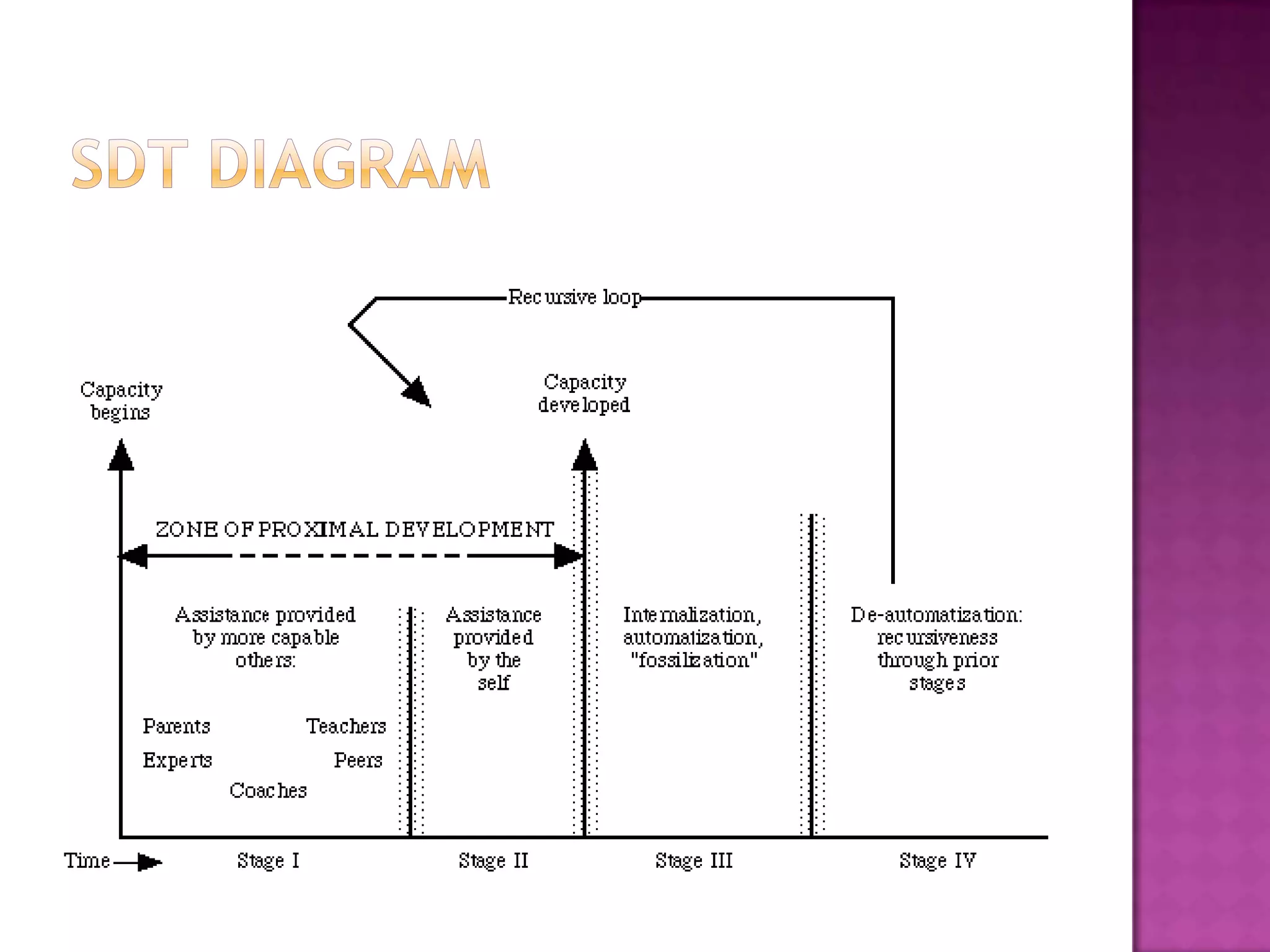 The Social Development Theory argues that social interaction precedes development and causes cognitive development. It was developed by Lev Vygotsky, who believed that learning occurs in the Zone of Proximal Development, which is the distance between what a learner can do independently and with guidance. In the Zone of Proximal Development, a More Knowledgeable Other, such as a teacher, helps guide the learner's development. According to the theory, teachers should first have students work collaboratively in groups when learning new concepts before doing independent work to reinforce the ideas on their own.