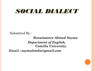 The document discusses social dialects, which are distinct varieties of a language influenced by social factors such as class, education, and profession, contrasting them with regional dialects that are influenced by geography. It highlights examples of social dialects from England and Bangladesh, illustrating differences in vocabulary, pronunciation, and grammar across social classes. Additionally, it touches on how social variation can relate to age, ethnic background, and registers linked to specific occupations.