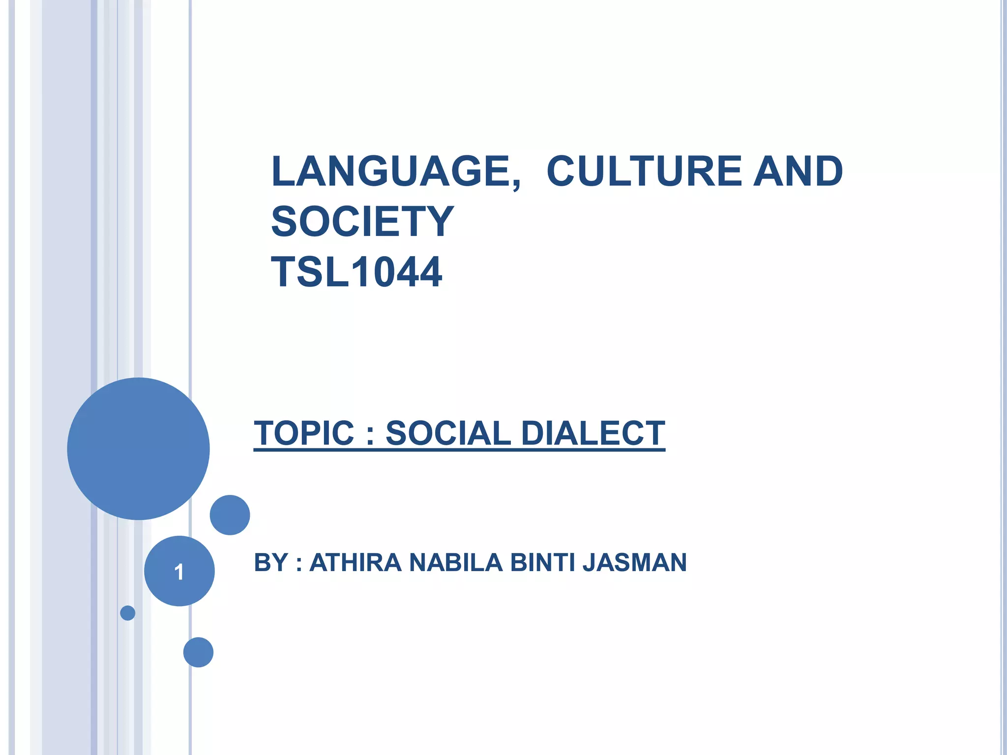 This document discusses social dialects and how they differ from regional dialects. It defines dialect as a variety of a language that signals where a person comes from and is influenced by their social background. Social dialect, also called sociolinguistics, refers to variations in language based on social factors like ethnicity, gender, age, and social class. Regional dialect depends more on the geographical area where a language is spoken. While both reflect social variations in language use, social dialects are influenced more by social barriers between groups rather than geographical distance.