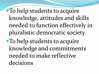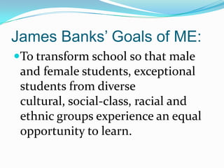 This document discusses multiculturalism and multicultural education. It defines multiculturalism as emphasizing unique cultural characteristics and their relationships in receiving nations. The advantages are listed as leading cultural exchanges, adding variety to citizens' lives, and bridging ignorance. The disadvantages include anxiety over national identity, disunity, and questionable loyalties. Multicultural education aims to create equal opportunities and transform schools and society. It discusses four approaches: contributions, additive, transformation, and social action. The goals are preparing students for a pluralistic society and promoting democracy.