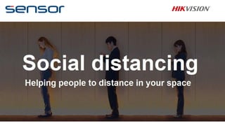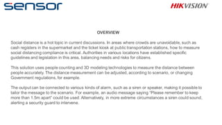 The document discusses a solution for measuring social distancing compliance using people counting and 3D modeling technologies, particularly in crowded areas like supermarkets and public transport stations. It highlights the ability to customize distance measurements and alarms in accordance with regulations, offering alerts ranging from audio reminders to sirens for security intervention. Additionally, it mentions features like facial recognition and people counting capabilities to enhance monitoring effectiveness.