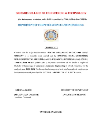 The document is a major project report submitted by 4 students for their Bachelor of Technology degree. It discusses developing a system to predict social distancing using OpenCV by detecting and tracking people in surveillance videos. The proposed framework would use YOLO v3 for object detection, Deepsort for tracking, and compute the pairwise distance between objects to check for social distancing violations based on WHO guidelines. The system is aimed to help prevent the spread of COVID-19 when social distancing is a key containment measure as no vaccine currently exists.