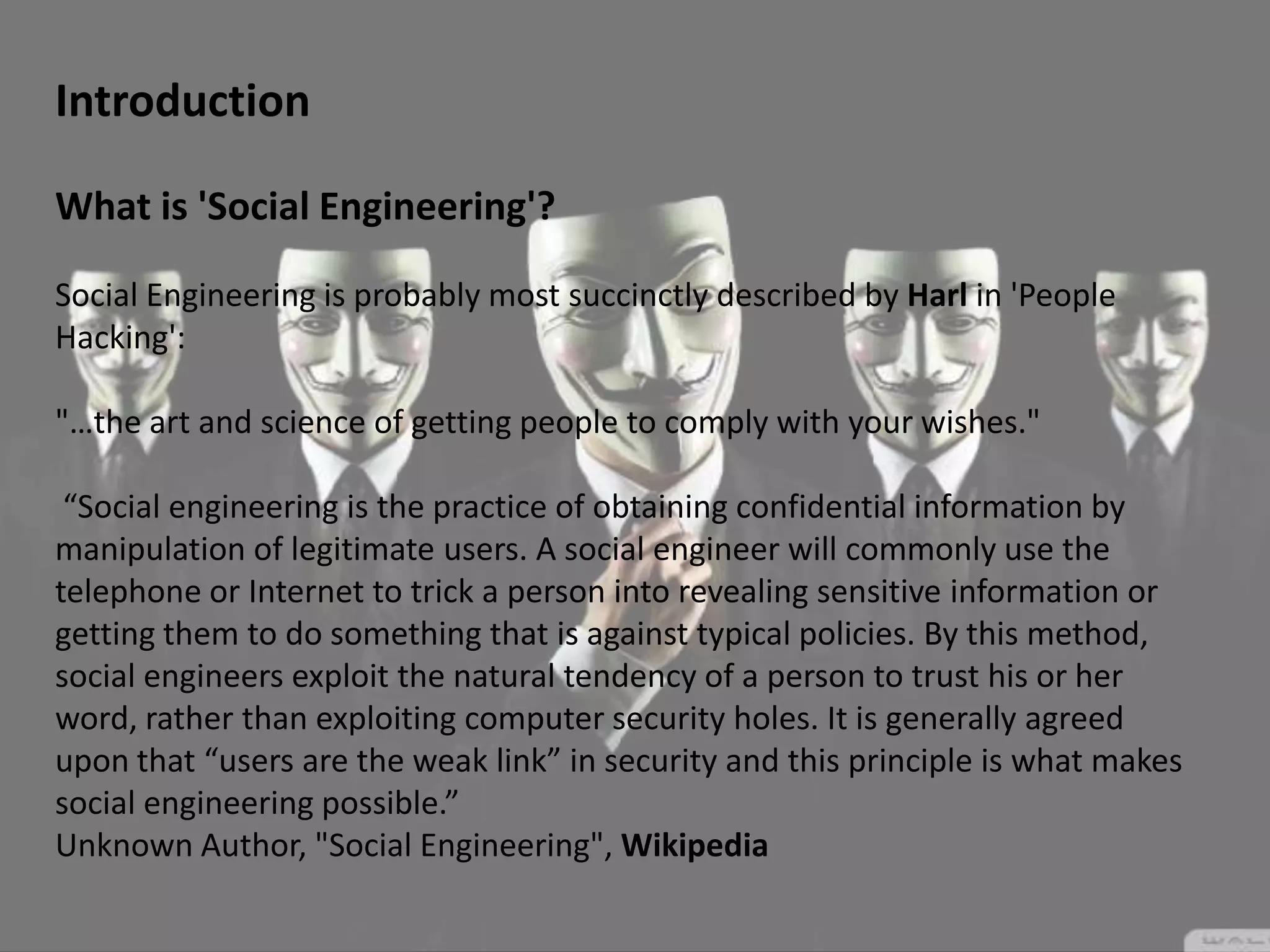 Social engineering is a type of attack that manipulates people into revealing sensitive information or performing actions that violate security policies. It works by exploiting human trust and the natural tendency to help others. Attackers first gather information about targets, then develop relationships to gain trust before exploiting that trust to obtain access or steal information. Common social engineering techniques include phishing emails and calls where attackers pretend to be from technical support. While no system can fully prevent social engineering, organizations can minimize risks by educating users and restricting what sensitive information users provide over the phone or to unknown parties.