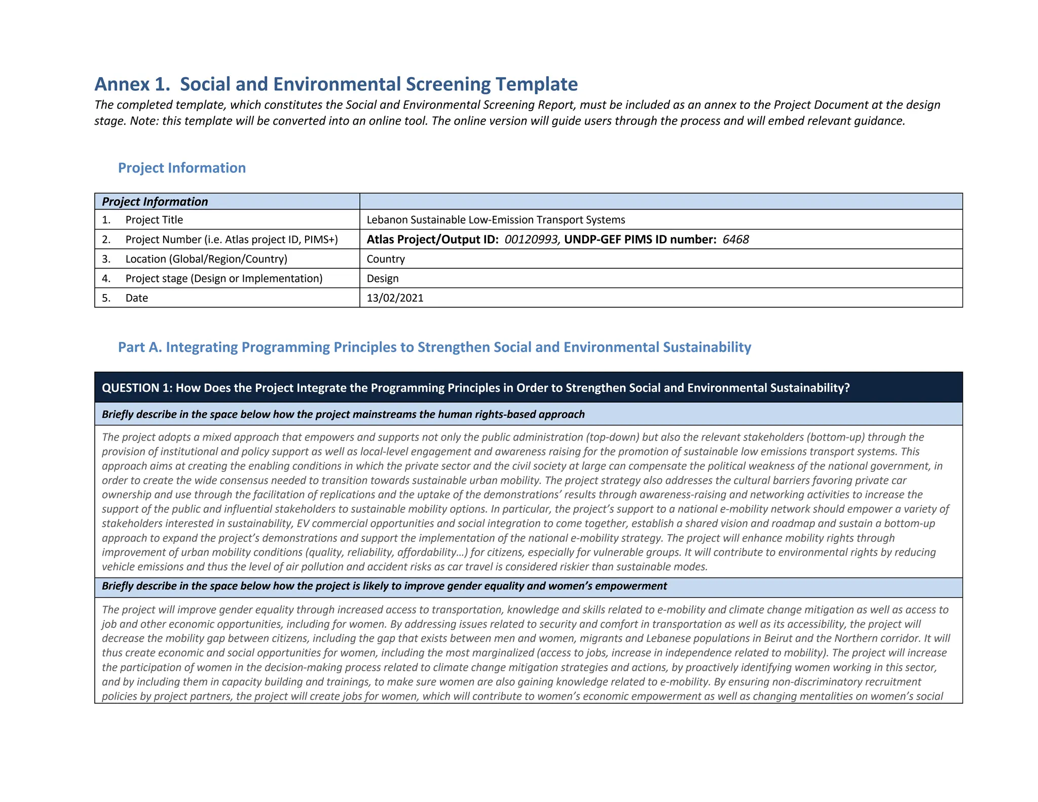 The document outlines a social and environmental screening template for the Lebanon Sustainable Low-Emission Transport Systems project, emphasizing the integration of human rights, gender equality, and sustainability principles in its design. It identifies potential social and environmental risks, including marginalized populations' involvement in decision-making and impacts from project activities. The project is categorized as having substantial risk, necessitating management and assessment plans to address identified risks during implementation.