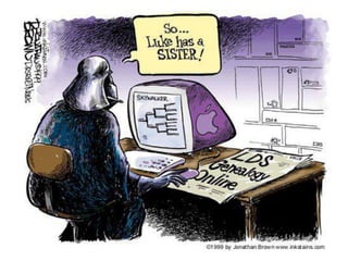 The document discusses the role of social media in personal identity and family connection, inviting users to engage with their family history through platforms like Facebook and Instagram. It encourages taking family selfies and creating profiles for ancestors to share their stories. Additionally, it contrasts the record-keeping practices of the Mulekites and Nephites, integrating app recommendations that promote family engagement.