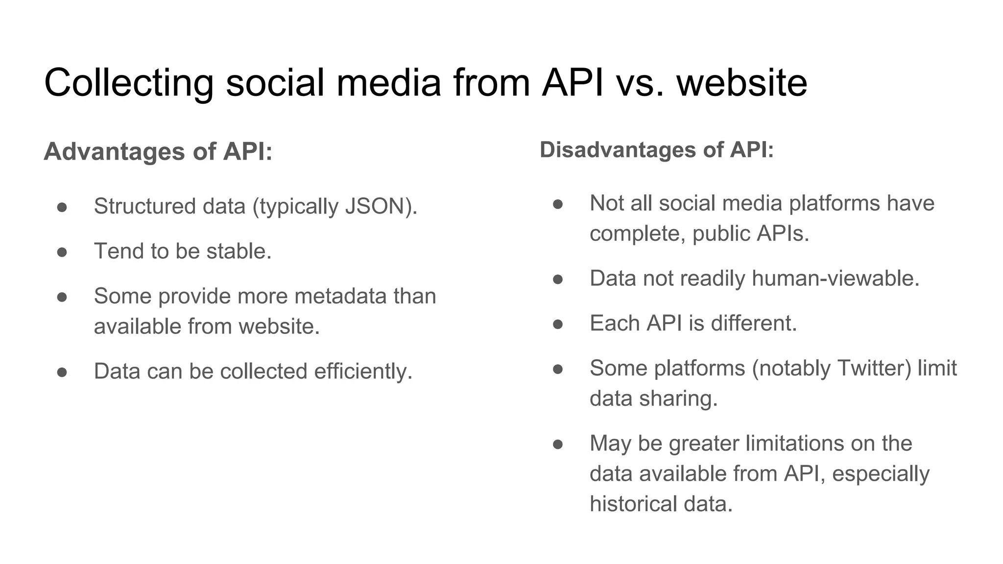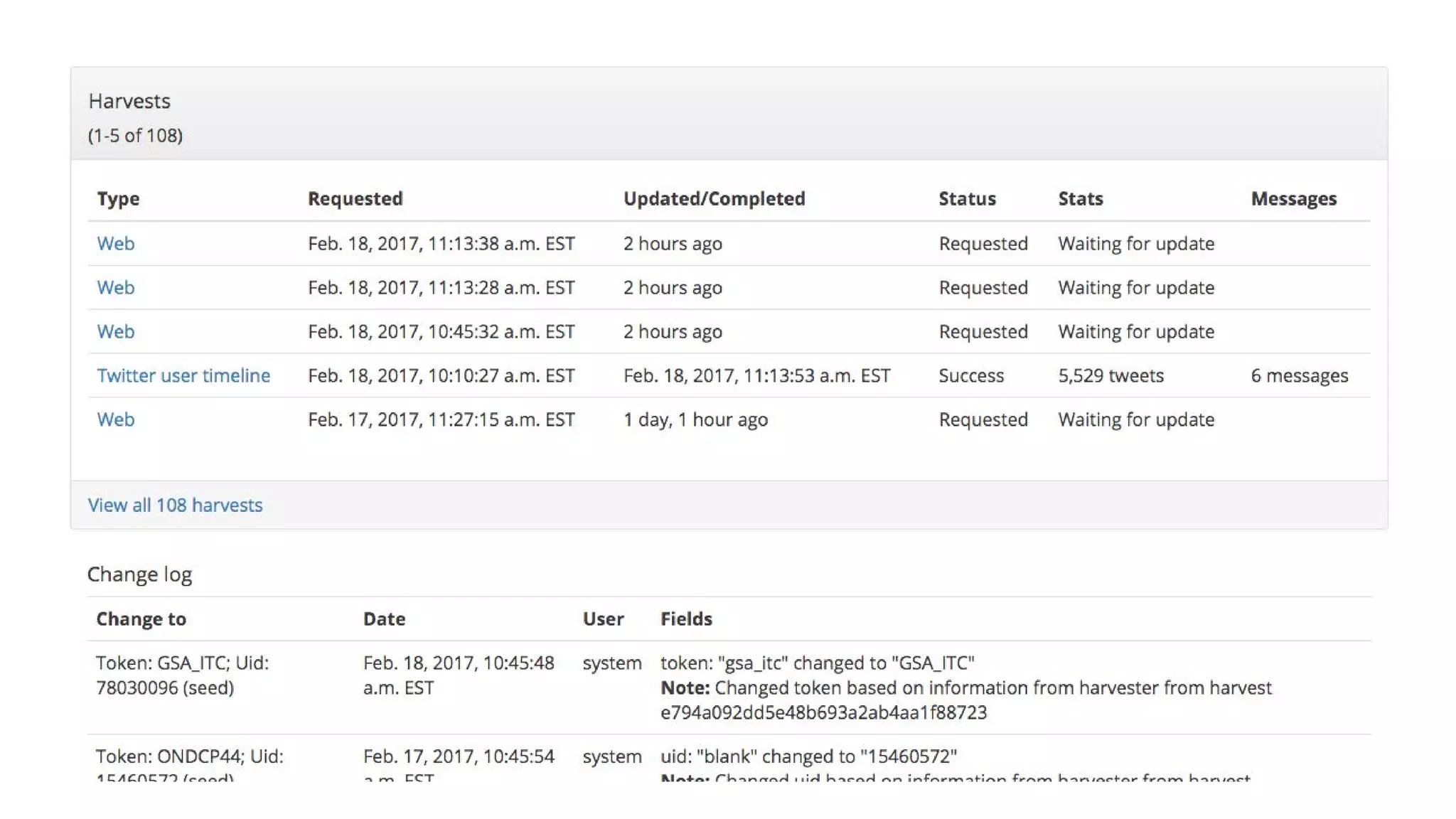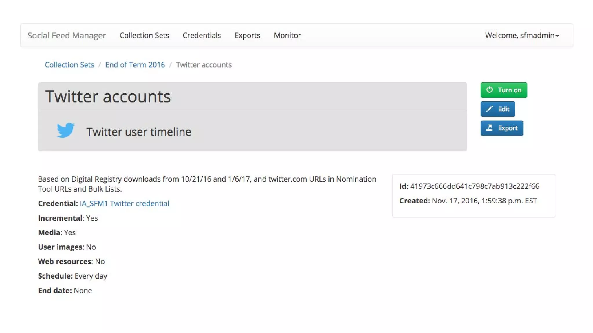 The document discusses the Social Feed Manager (SFM), an open-source tool developed for collecting social media data, particularly from APIs like Twitter and Tumblr, and highlights its advantages and disadvantages. It emphasizes its intended use for researchers and archivists, offering several example collections including the 2016 U.S. election and federal terms from 2017-2020. Additionally, it provides contact information for further inquiries.