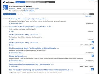 This document discusses using personal social networks as collaborative filters to find relevant information. It outlines that while search engines may return a high volume of results, most are irrelevant. Social networks could provide higher precision by leveraging relationships and shared interests among friends. The document proposes four solutions for social filtering: tagging, recommender systems, social search engines that integrate friends' shared content, and asking friends directly using social media. However, it notes that social filtering comes with its own tradeoffs and is not a perfect solution.