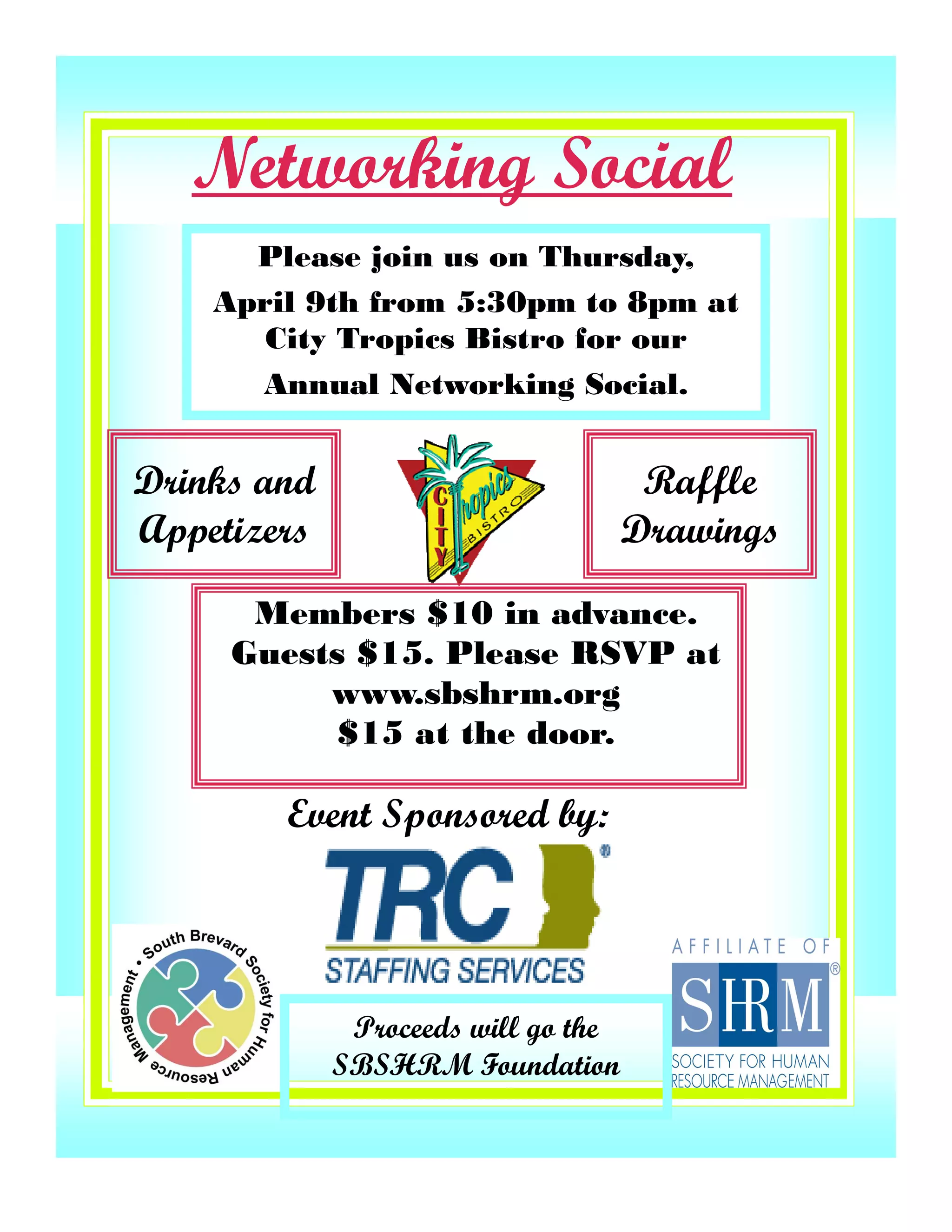 An annual networking social event is scheduled for April 9th from 5:30 PM to 8 PM at City Tropics Bistro. Members can attend for $10 in advance, while guests will pay $15, with proceeds supporting the SBSHRM Foundation. RSVP is required at www.sbshrm.org, and tickets will cost $15 at the door.
