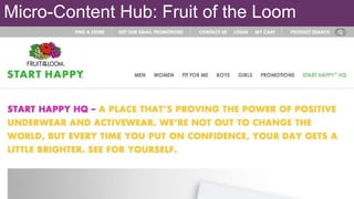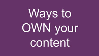 The document discusses owning your own content strategy and summarizes ways brands can own their content, such as through micro-content hubs, learning centers, and blogs. Specific examples are provided of companies that have effectively used these owned content strategies, including Fruit of the Loom, Health Catalyst, Century 21, Liberty Mutual, and Wise Matchmaking. The document emphasizes that owning your own content is important for brands as social media networks continue to monetize through advertising to brands rather than users.
