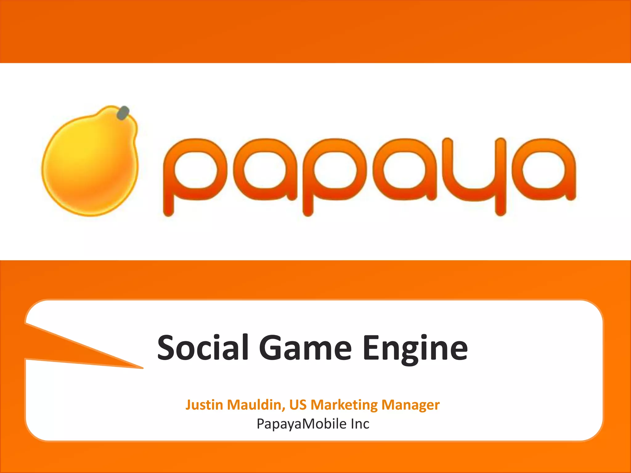 The document discusses PapayaMobile's Social Game Engine, a cross-platform game development tool. It includes integrated social features like friend systems, notifications, and leaderboards. It uses a script-based language similar to ActionScript and supports 2D graphics, physics, and particles. The engine allows games to be deployed across Android and iOS with one codebase. It also offers cloud server hosting, virtual currency systems, and revenue sharing models for developers.