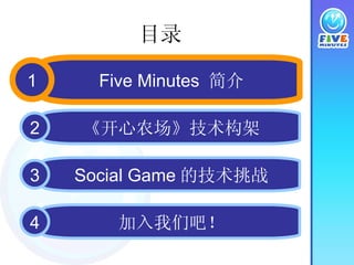 目录 Five Minutes 简介 《开心农场》技术构架 Social Game 的技术挑战 加入我们吧! 1 1 2 3 4