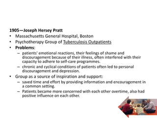 The document discusses the history and definitions of social group work. It describes how Joseph Pratt in 1905 used group therapy with tuberculosis patients to provide inspiration, support, and encouragement. It then discusses definitions of social group work from various scholars that describe it as a method to help groups achieve goals and enhance social functioning through face-to-face interactions. The rationale and basic assumptions of social group work are also summarized, which include the ideas that groups can effect individual change and offer a sense of belonging through shared experiences and mutual aid.