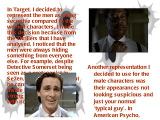 The document discusses representations of social groups in the thriller genre. It notes that male characters are often portrayed as secretly hiding something sinister beneath normal appearances. Women are commonly represented as obstacles for men to overcome and are frequently killed off. The main character in the discussed thriller, Brad, has several mental disorders and represents how those with disabilities can also pose harm due to past experiences of neglect or abuse.