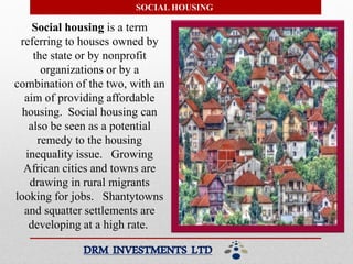 The document discusses the issue of social housing in Africa, highlighting severe shortages exacerbated by rapid urbanization and rising populations in regions like West and East Africa. It emphasizes the need for government subsidies, low-interest loans, and innovative construction methods to make housing more affordable and accessible for families. The document also illustrates the role of various institutions in addressing these challenges and promoting social housing development across the continent.