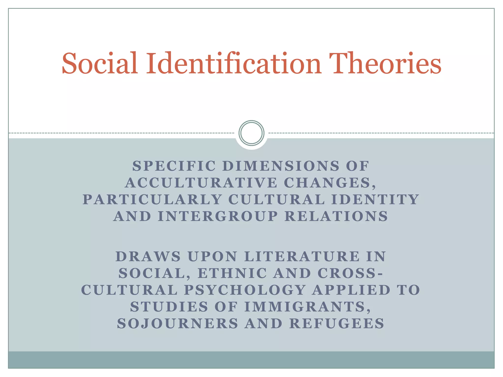 This document discusses social identification theories as they relate to acculturating individuals and groups. It draws from literature on social, ethnic, and cross-cultural psychology applied to immigrant, sojourner, and refugee studies. Key aspects covered include cultural and ethnic identity formation; social identity theory and the importance of group membership for self-esteem; intergroup biases, attitudes, and relations; and the influence of characteristics like perceived discrimination on acculturation and adaptation outcomes.
