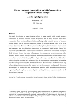 This thesis investigates how social influence within virtual consumer communities affects product attitudes, emphasizing processes of compliance, identification, and internalization, with social capital as a key antecedent. The research reveals that internalization has the strongest impact on attitude change, followed by compliance, while identification shows only an indirect effect. Data collected from five communities indicates that the social context of these communities significantly shapes interpersonal persuasion processes and product attitudes.