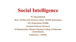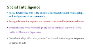 Social intelligence involves the ability to successfully build relationships and navigate social environments. Strong relationships improve health while loneliness causes stress and health problems. Social intelligence was first defined by Edward Thorndike as understanding and managing people. It involves skills learned over time rather than being innate. The brain has structures like spindle cells and mirror neurons that help guide social decisions and predict others' behavior. Signs of social intelligence include effective listening, conversation skills, and lack of arguing. Developing it involves paying attention to others, increasing emotional intelligence, and practicing active listening.