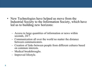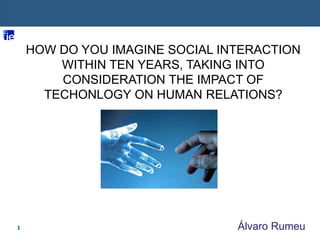 The document discusses the dual impact of technology on social interaction, highlighting both its benefits, like global communication and access to information, and drawbacks, such as social isolation and the potential for misinformation. It raises concerns about future generations being overly reliant on devices, thereby diminishing personal relationships and authentic self-representation. The author advocates for a balanced approach to technology use, emphasizing the need for guidance in teaching children how to navigate its influence responsibly.