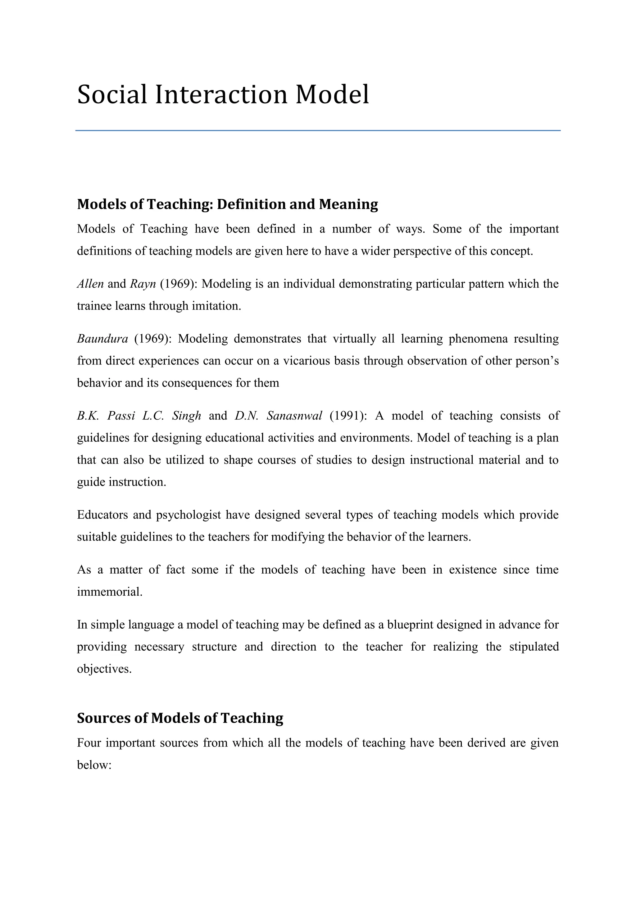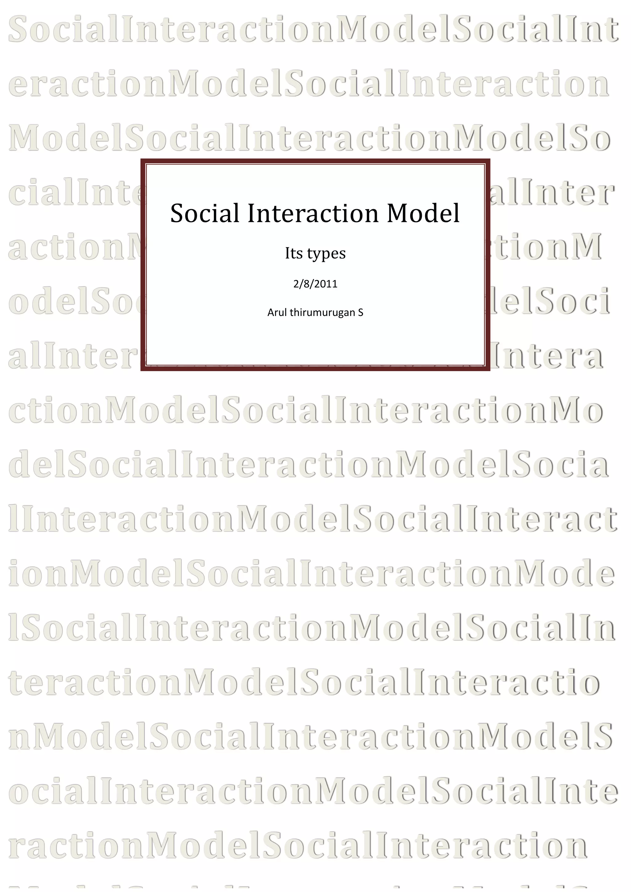 This document provides an overview of social interaction models of teaching. It defines social interaction models as instructional methods that facilitate group work and student-to-student interaction. The document discusses the theoretical origins of social interaction models according to thinkers like Dewey and Bandura. It also outlines the key strategies of social interaction teaching, including introducing topics, forming student groups, monitoring group work, and presenting findings. Finally, it notes some advantages and disadvantages of the social interaction approach.