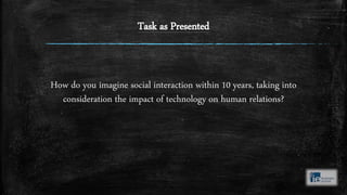 The document discusses how social interaction has transformed over time through various mediums and how it will continue to change within the next 10 years due to emerging technologies. It describes several technologies that may impact social interaction, including holograms, brain-computer interfaces, augmented reality, artificial intelligence, and how these could allow for new types of virtual communication and information sharing that removes barriers for those with disabilities. However, it also notes there is a risk that overreliance on technology could diminish real-life social interaction, so it will be important that new technologies are used to enhance knowledge rather than replace human relationships.