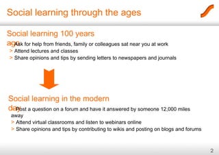 The document discusses the evolution of social learning from traditional methods to modern practices facilitated by technology, highlighting three case studies in customer service training, language learning, and compliance training. It outlines the challenges and requirements for each case, detailing various training approaches utilized to enhance employee performance and motivation. The document concludes with key benefits and tips for implementing effective social learning strategies in organizations.