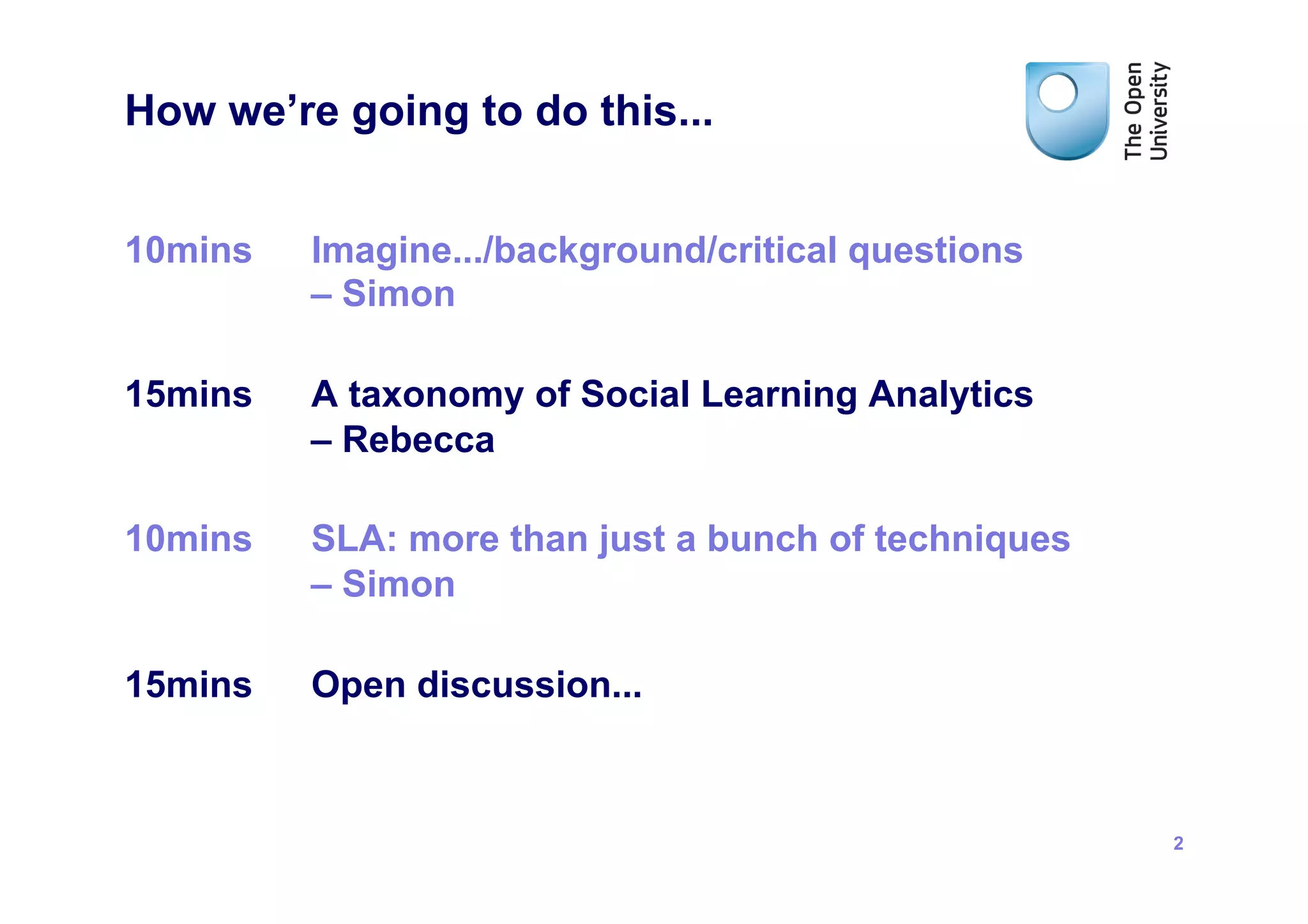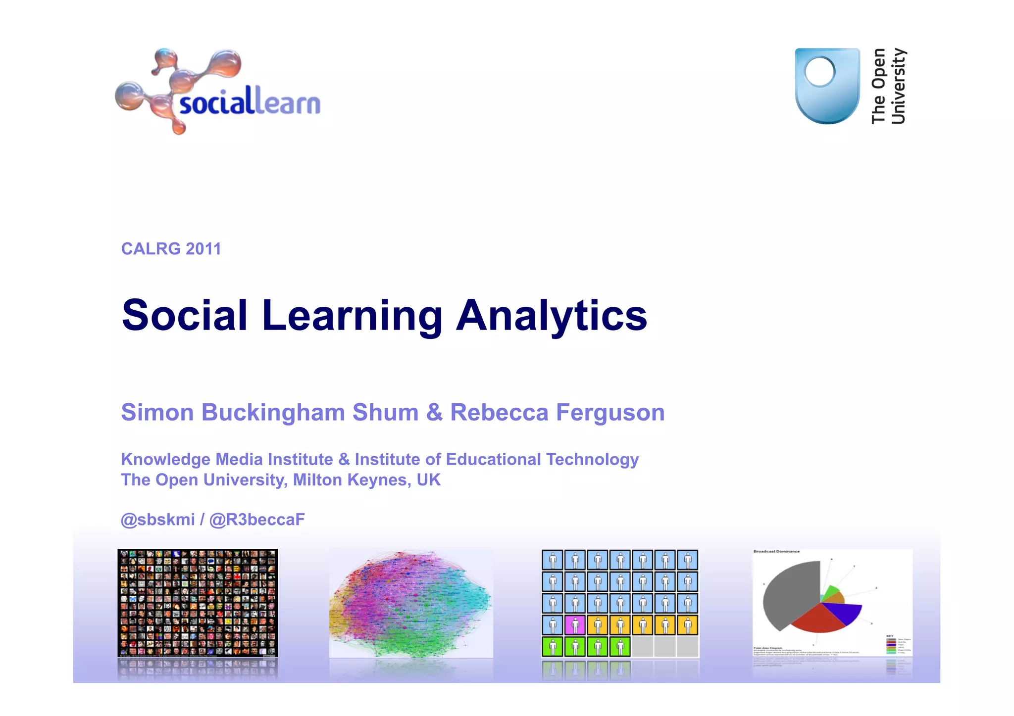 1) The document discusses social learning analytics, which examines how learners interact and engage in social learning networks, discourses, and contexts.