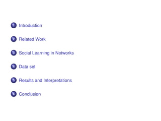 The document discusses social learning in networks, focusing on extracting deterministic rules from human behavior in economic experiments. It highlights the contrast between traditional economic theories and data-driven approaches, illustrating how human decision-making deviates from rational expectations. The authors present findings on correlations between signals and decisions, emphasizing the potential of data mining and machine learning techniques for understanding human behavior in economic contexts.