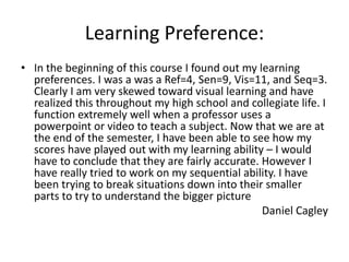 Daniel took a learning preferences assessment and found he is strongly visually oriented with high scores in visual and sequential learning. He explored using social networking like Twitter to collaborate with classmates, asking questions to TAs. Screencasts also helped him learn new software by tapping into his visual learning. Games surprised him as a learning tool by making memorization fun. Overall, social networking helped the most by facilitating real-time collaboration, and he will continue using social tools that support his visual learning style.