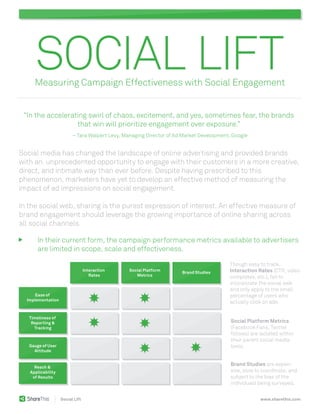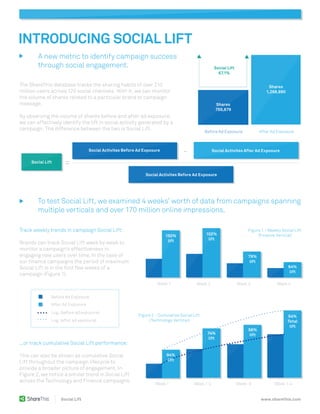 1) The document introduces Social Lift, a new metric for measuring the impact of ad campaigns on social engagement by comparing the volume of shares before and after ad exposure.