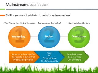 The document discusses the concept of social localisation in translation and localisation, emphasizing the challenges and opportunities presented by the vast amount of content and diverse communities worldwide. It highlights the need for new technologies and collaborative approaches to enhance content accessibility across languages. Key organizations and initiatives, such as the Rosetta Foundation, are mentioned as vital to promoting community support and resource sharing in this effort.