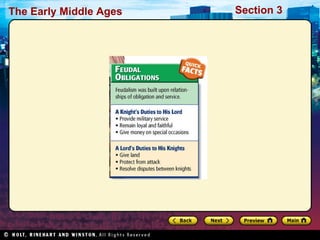 The document summarizes the feudal and manorial systems that governed medieval Europe. Under the feudal system, lords gave land (fiefs) to knights in exchange for military service and loyalty. Peasants lived and worked on large estates (manors) under the manorial system, farming the land in exchange for protection from their lords. Life in villages was difficult, with peasant families living in basic one-room houses and working constantly, while castle life was more comfortable but still lacked modern conveniences.