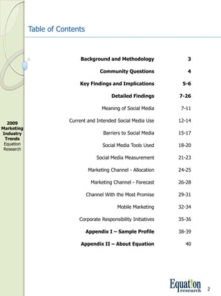The 2009 marketing industry trends report reveals that social media adoption has significantly increased among companies, with two-thirds currently using or planning to implement social media strategies in the next year. Key findings highlight the barriers to adoption, such as lack of knowledge, measurement uncertainties, and resource allocation, particularly among smaller businesses. The report emphasizes a need for structured frameworks and processes to guide marketers in effectively integrating social media into their broader marketing strategies.