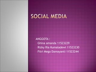 Dokumen tersebut membahas tentang media sosial dan perkembangan jaringan sosial. Media sosial adalah media online dimana pengguna dapat berpartisipasi, berbagi konten seperti blog, jejaring sosial, wiki, dan dunia virtual. Jaringan sosial pertama kali muncul pada tahun 1995 dengan Classmates.com dan berkembang untuk membangun pertemanan tanpa harus mengenal satu sama lain terlebih dahulu.