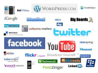 This document provides an overview of using social media for organizations. It discusses planning a social media strategy, choosing appropriate tools like Facebook, Twitter, YouTube and blogs to engage different audiences. The document emphasizes starting conversations rather than just broadcasting information. It also addresses allocating time for social media and measuring its impact. The overall message is that social media can help organizations achieve their goals when used strategically and for the right purposes.