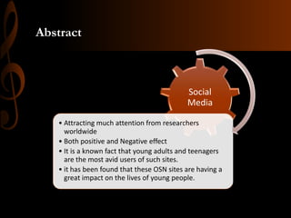 The document discusses the influence of social media on youth, highlighting both its positive and negative effects, with young people being the primary users. Key findings include the high engagement in social networking, information seeking, and online shopping activities, alongside issues such as internet harassment and diminished interpersonal skills. The conclusion emphasizes that while social media connects youth, it also contributes to a range of negative outcomes, including reduced confidence and serious health concerns.