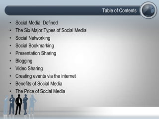 This document discusses presenting social media to clients. It defines social media as communicating, creating, sharing, and discussing news and information online. It then outlines the six major types of social media: social networking, social bookmarking, presentation sharing, blogging, video sharing, and creating events via the internet. For each type, it provides examples of websites to focus on and how businesses can use those websites to market products, promote events, receive feedback, and more. The document concludes by stating the benefits of social media include appealing to younger customers, saving money, promoting businesses, and managing reputation, while the price can be very low or even free.