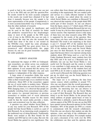 The paper investigates the influence of social media on undergraduate research, noting that platforms like Facebook have opened new avenues for data collection and engagement. While it highlights the benefits of utilizing social networking sites for research, such as faster data collection and greater resource access, it also addresses concerns regarding the reliability of data gathered from anonymous users. Ultimately, the findings suggest that despite being underutilized, social media has significant potential to enhance research practices among undergraduates.